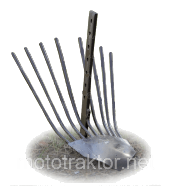 В задней части копалки установлено 8 зубцов из стального прута Ø10 мм. Они эффективно просеивают землю и отделяют клубни картофеля от почвы. Общая длина устройства – 550 мм, максимальная ширина – 350 мм.