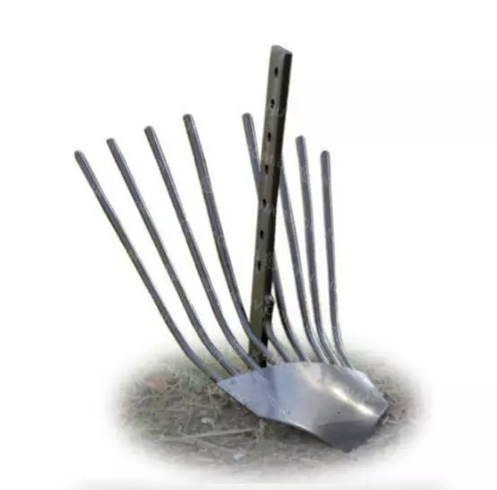 Зубья изготовлены из стального прутка D-10 х 400 мм. Общая длина копалки (от носика лопаты до края зубьев) составляет 500 мм, максимальная ширина по крайним точкам — 350 мм.