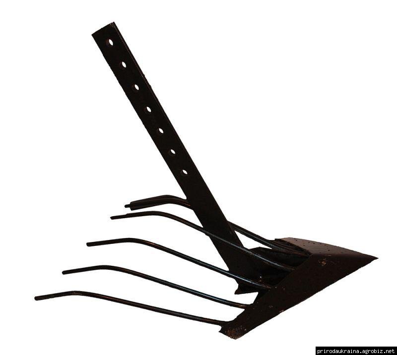 Стойка картофелекопателя изготовлена из стальной полосы 10 х 40 х 500 мм. Имеется 7 отверстий диаметром 12,5 мм, под болт М12. Лопата изготовлена из стали и имеет толщину 3 мм. Длина от носика лопаты до стойки составляет 210 мм. Есть усилитель из стального листа толщиной 4 мм и подошва толщиной 4 мм. В задней части копалки имеются перья (они же зубья), их восемь. Зубья изготовлены из стального прутка Ø10 мм. Общая длина копалки (от носика лопаты до края зубьев) составляет 500 мм, ее максимальная ширина по крайним точкам 280 мм. При тяжелых грунтах данное орудие облегчит процесс выкапывания за счет менее массивного носика лопаты.