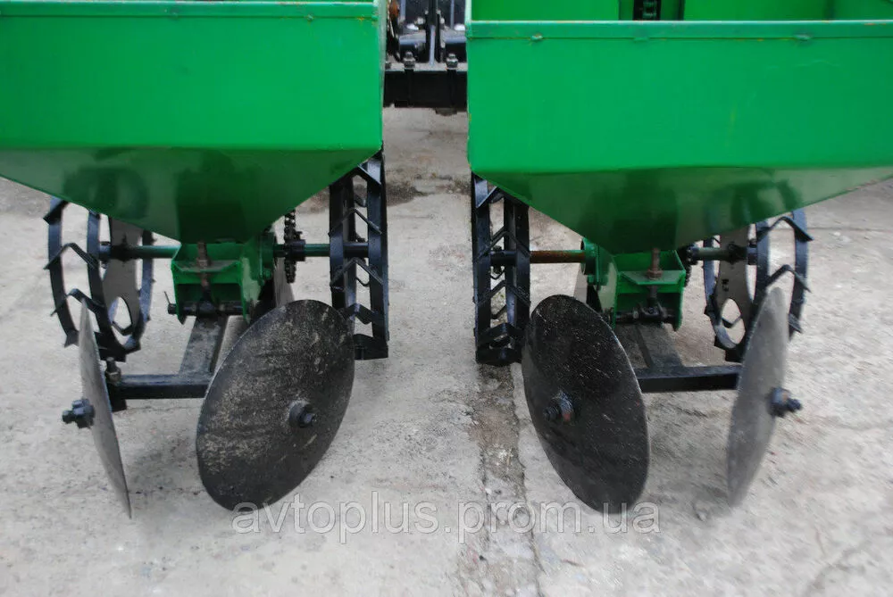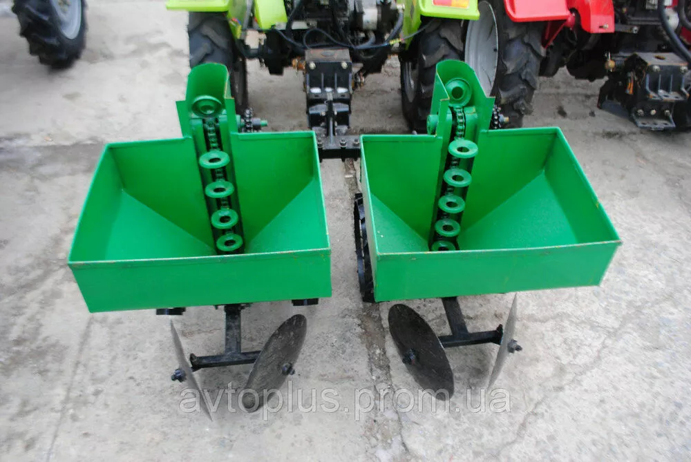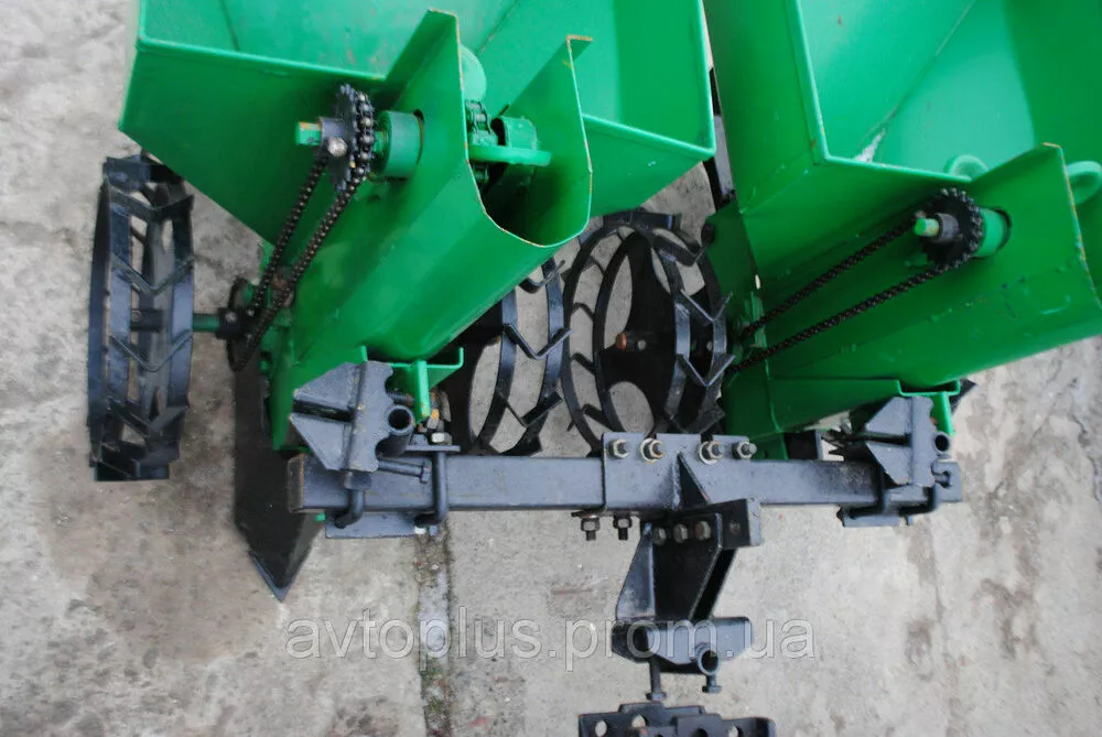 двохрядна картоплесаджалкаМеханічна саджалка призначена для дворядної посадки картоплі на попередньо оброблених і підготовлених ґрунтах. Забезпечує швидку і якісну посадку картоплі. Агрегатується з мотоблоками потужністю не менше 6 к.с. Саджалку характеризується високою продуктивністю, простотою конструкції і зручністю в експлуатації.Є можливість регулювання кроку посадки.Дворядна навісна саджалка для картоплі приєднується до мінітрактора за допомогою заднього навісного пристрою (ЗНП). Саджалки взаємодіє з мінітракторами оснащеними ЗНП . Вона виконує всі операції в одному робочому циклі, пов’язаних з висаджуванням картоплі тобто оре борозни, автоматично висаджує картоплю і підгортає землю, формуючи гряди. Картопля може висажуватся в міжряддях на відстані 50 см при можливості зміни відстані бульб в ряді (20 см, 25 см або 30 см) при глибині висаджування від 5 см до 20 см. Зміна відстані бульб в ряді здійснюється зміною діаметру привідних зірочок.обем 90литривДіаметр загортачів 30 см. Діаметр привідних коліс 35 смАгрегатується з мотоблочними тракторами