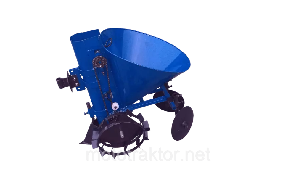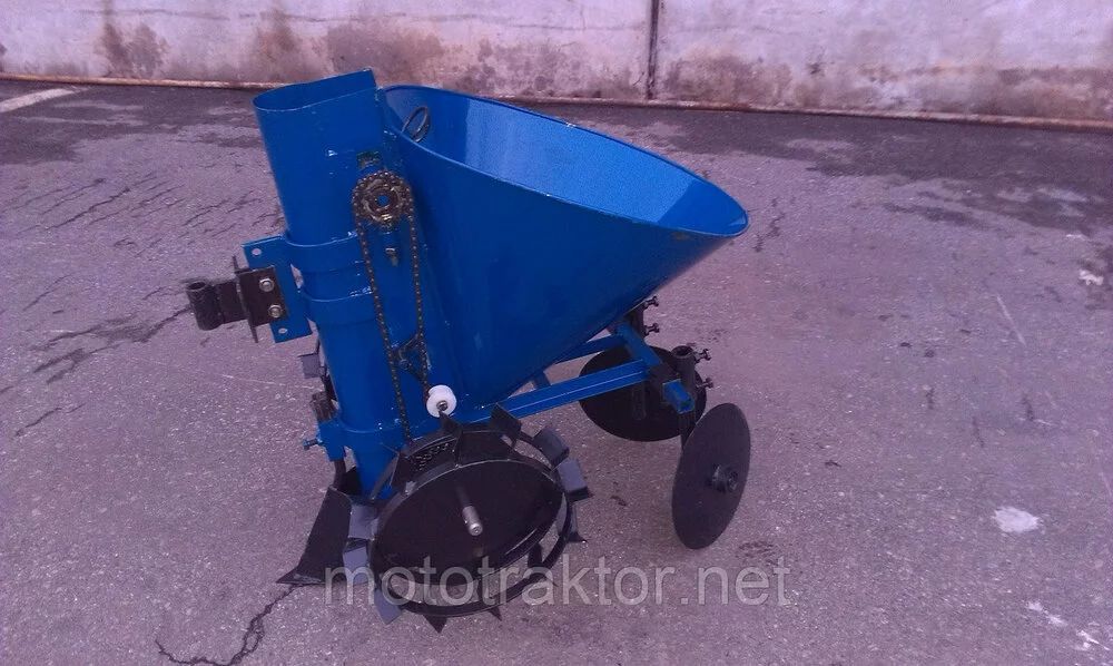 Картофеле Сажатель Мотоблочный — 1 ряд, транспортер Цепного типа, сажалка синего цвета.