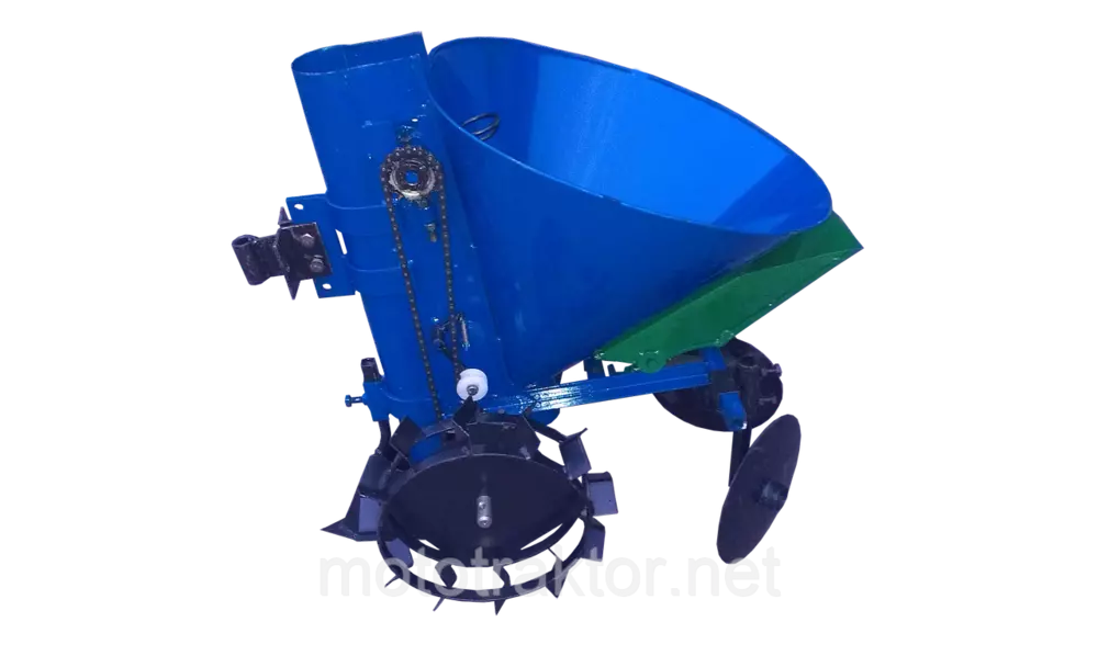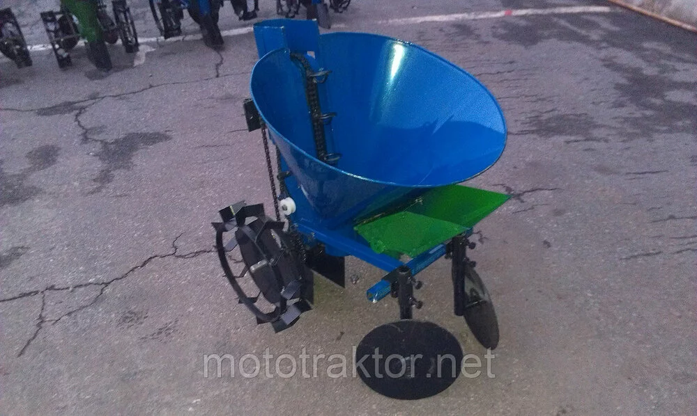 Картофеле Сажатель Мотоблочный — 1 ряд, транспортер Цепного типа, с бункером для Удобрений, сажалка синего цвета.