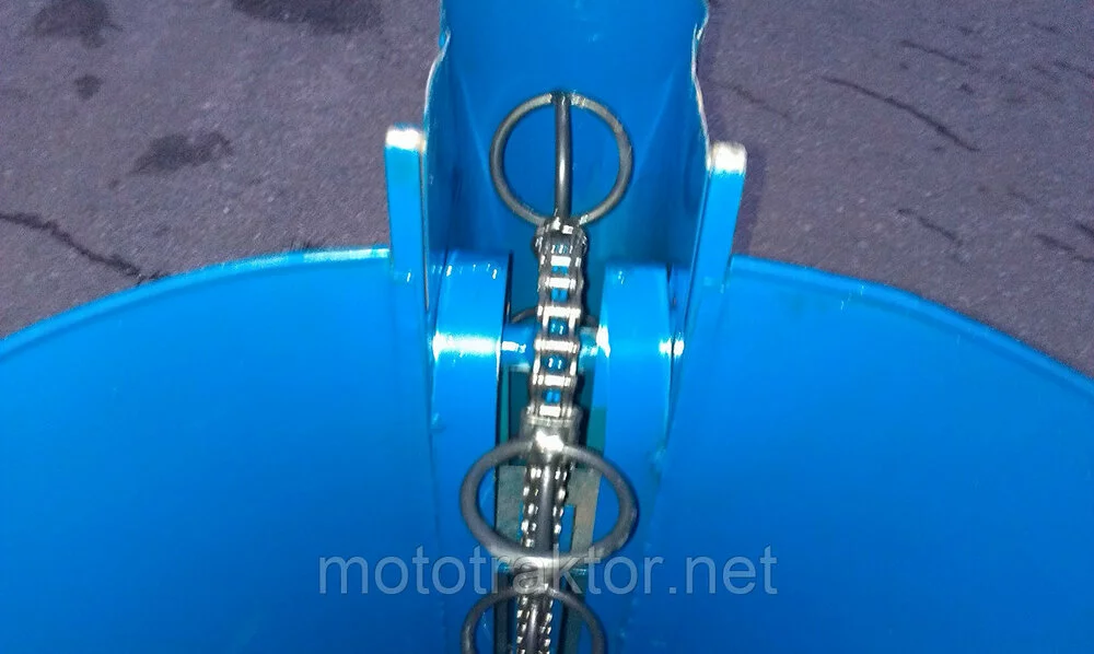 Приводная цепь натягивается благодаря ролику из качественного полимера, упорному рычагу и пружине. Этим обеспечена без перебойная и безотказная работа картофелесажалки.