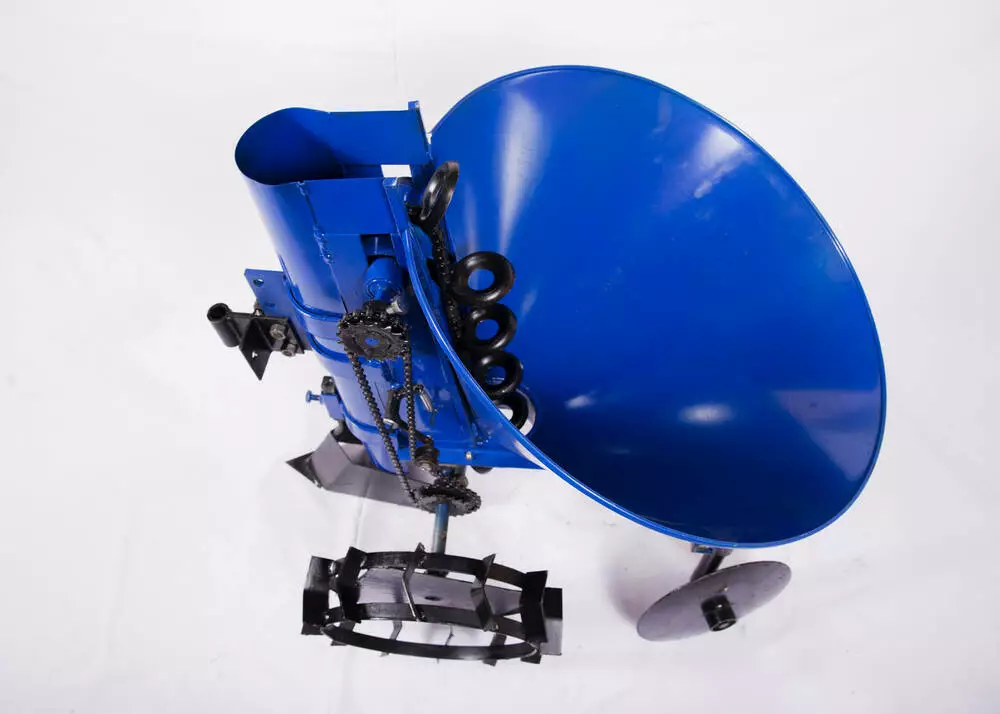 Картоплесаджалка однорядна для мотоблока призначена для механізованого садіння картоплі. Щоб змінювати крок посадки, використовуються змінні зірочки, що входять в комплект пристрою. Ланцюговий механізм оснащений чашками для забору картоплі.