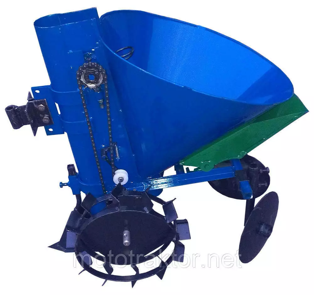 Картофеле Сажатель Мотоблочный — 1 ряд, транспортер Цепного типа, с бункером для Удобрений, сажалка синего цвета.