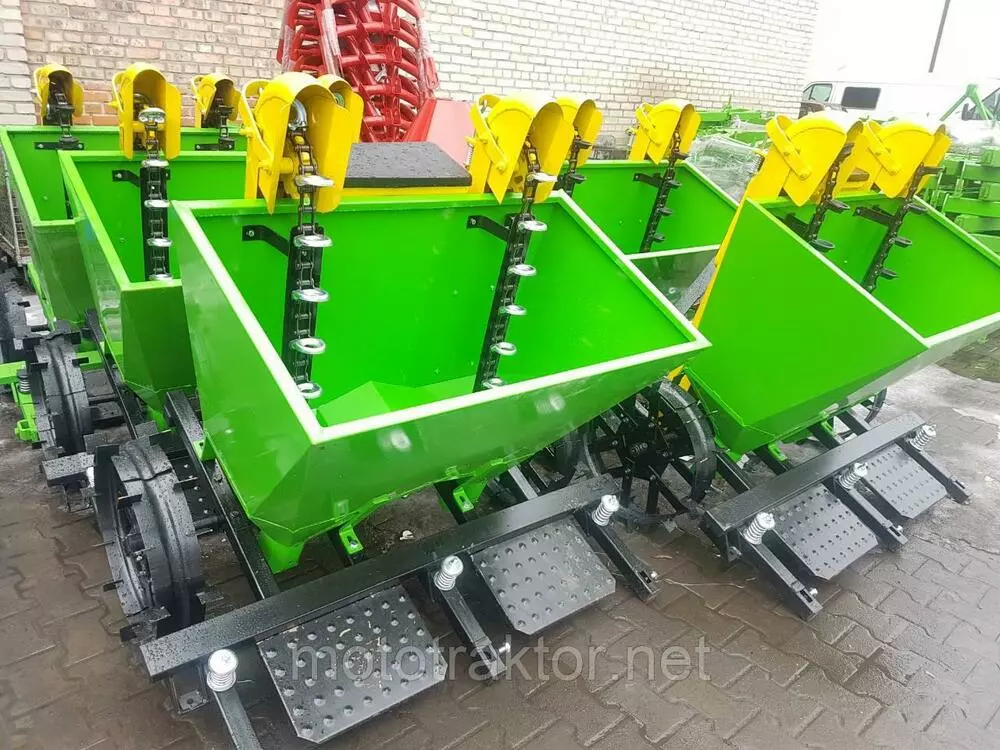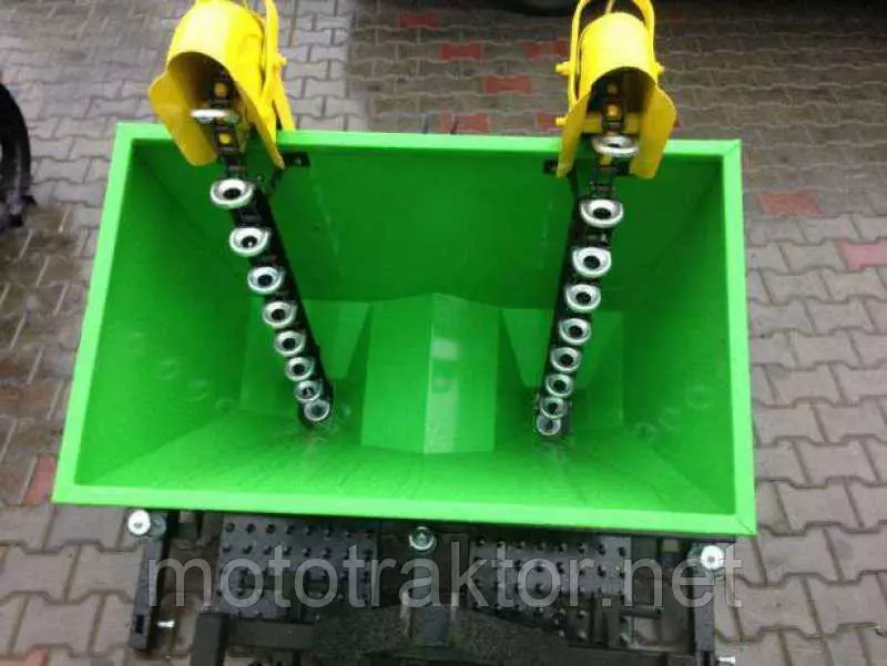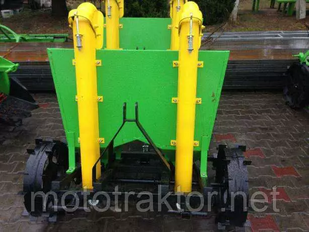 Двухрядная навесная сажалка для картофеля присоединяется к трактору при помощи заднего навесного устроства (ЗНУ). Сажалка взаимодействует с тракторами оснащёнными ЗНУ второй категории. Она выполняет все операци в одном рабочем цикле, связанным с высаживанием картофелей т.е. вспахивает борозды, автоматически высаживает картофель и окучивает землю, формируя гряды.