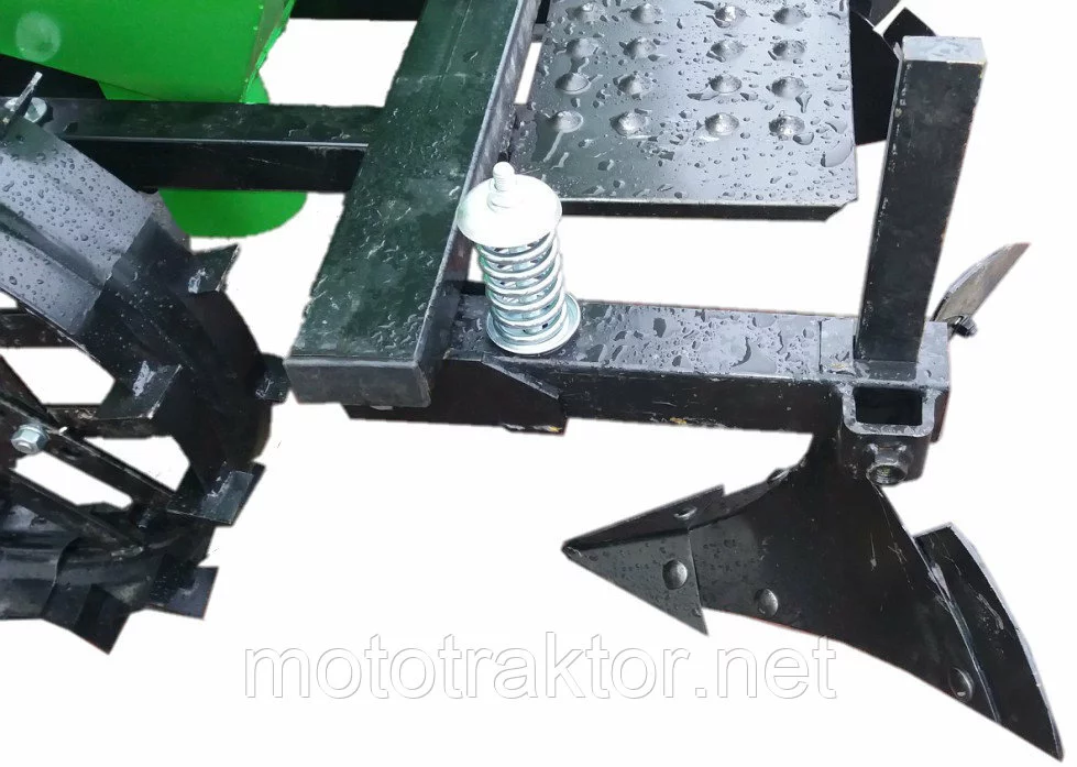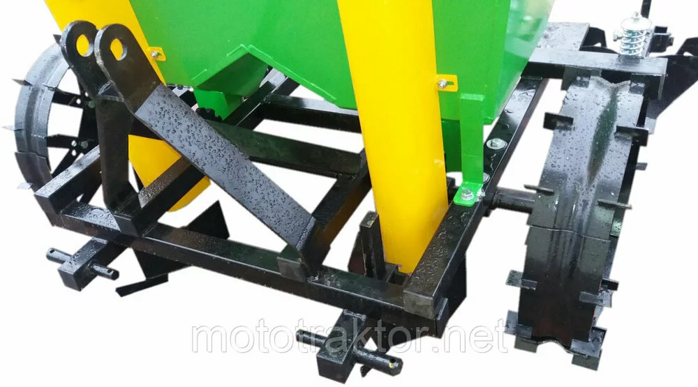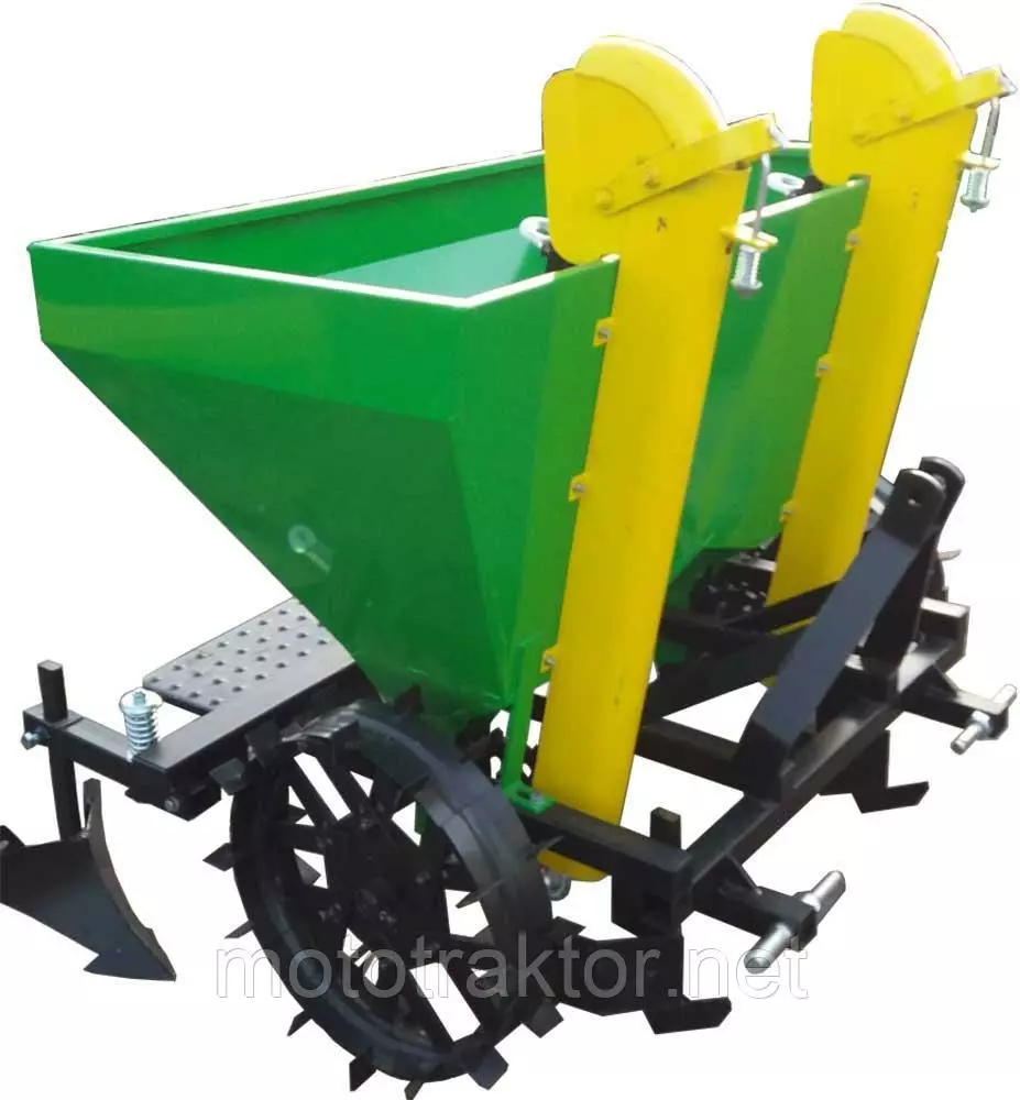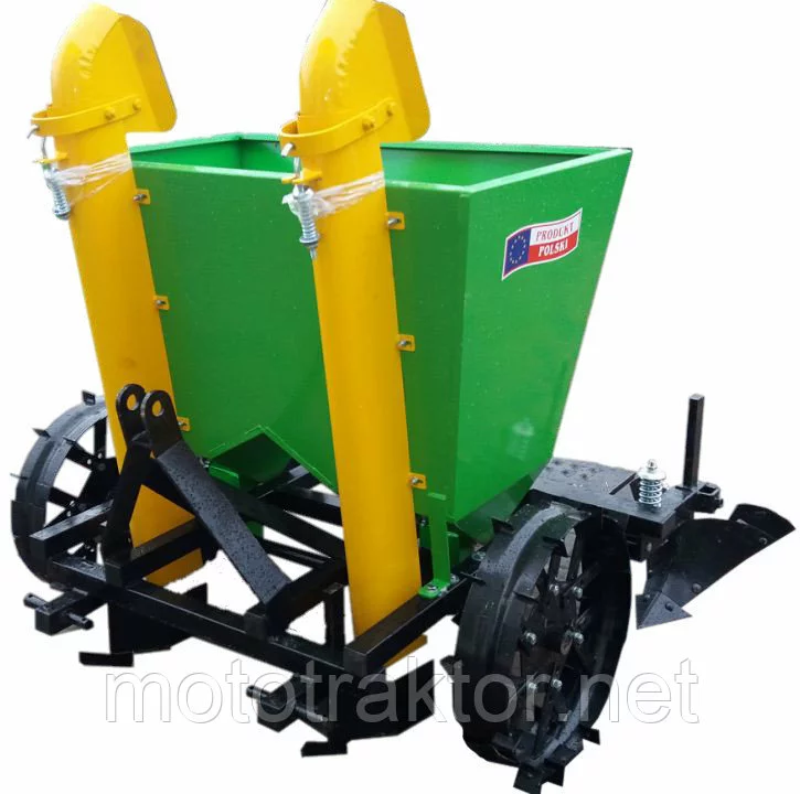 Двухрядная навесная сажалка для картофеля присоединяется к трактору при помощи заднего навесного устройства (ЗНУ). Сажалка взаимодействует с тракторами оснащёнными ЗНУ второй категории. Она выполняет все операции в одном рабочем цикле, связанным с высаживанием картофелей т.е. вспахивает борозды, автоматически высаживает картофель и окучивает землю, формируя гряды.