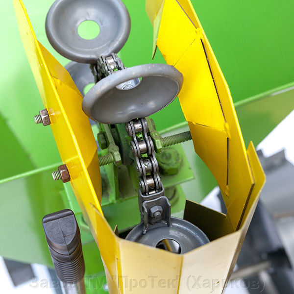 Картофелесажалка имеет удобный и надежный натяжитель приводной цепи на шпильке М16. Натяжитель находится в легкодоступном месте и регулировка натяжения цепи занимает минимальное время.