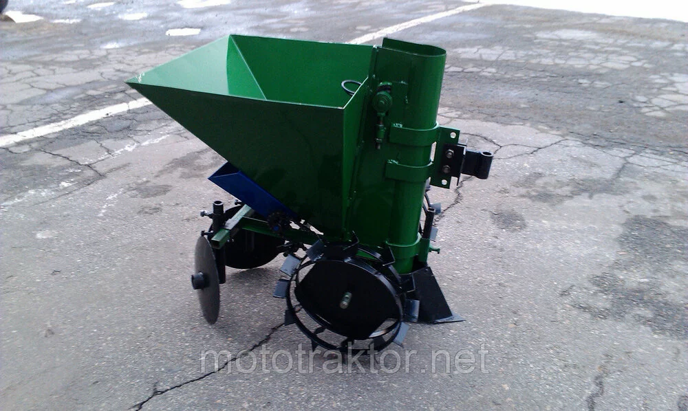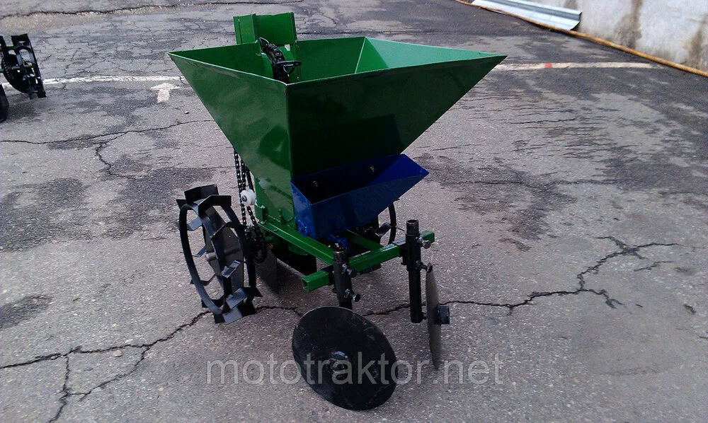 Картофеле Сажатель Мотоблочный — 1 ряд, транспортер Цепного типа, с бункером для Удобрений, сажалка зеленого цвета.