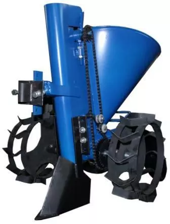 Однорядная цепная картофелесажалка предназначена для посадки картофеля  мотоблоком или мототрактораом