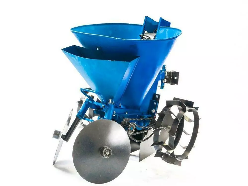 Основной узел картофелесажалки — бункер с шахтой в которой размещен механизм посадки. В шахте расположены опорные звездочки с цепью и корзинками. В механизме посадки используется приводная цепь ПР-12,7 — 18,2 (муравей, число звеньев 98), на ней установлено 12 корзинок диаметром 50 мм.