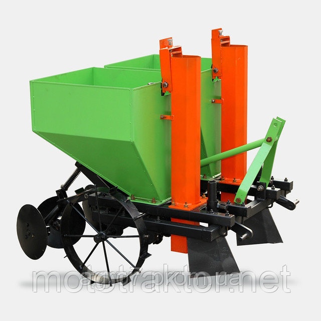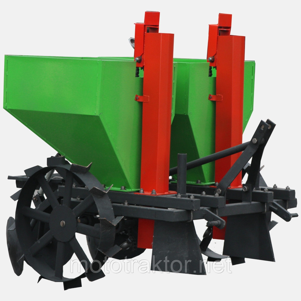 Новый современный двухрядный картофелесажатель предназначен для механизированного комфортного высаживания картофеля с помощью небольшого трактора. Навешивается на трехточечный навесной механизм сзади трактора. Разработан с учетом пожеланий и предложений украинских аграриев, профессионально выращивающих картофель: