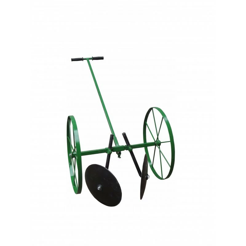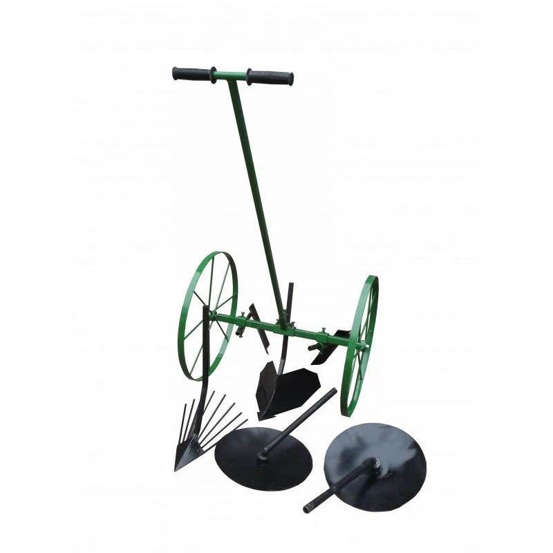 На основой раме крепятся колеса(большие 800 мм диаметр, два подшипника), в боковые замки вставляются два дисковых окучника или при посадке лопатки , в централный возле ручки- стреловидный.В одну сторону оператор тянет на себя и делает окучником борозду в которую укладывается картофель, на краю делается переворот, при этом внизу оказываются дисковые окучники или лопатки. В обратную сторону окучниками закапывается картофель.Таким же способом проводится окучивание и прополка.