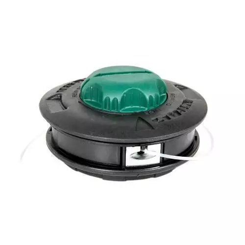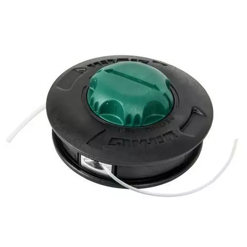Для заправки достаточно совместить метки, просунуть леску равными кусками сквозь отверстия катушки и накрутить ее с помощью  кнопки- маховика, который выполнен из прочного материала