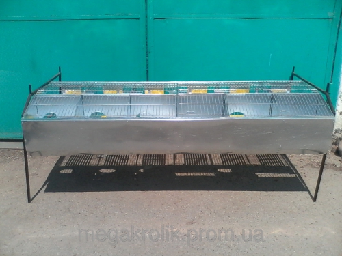 Клетка на 6 крольчих с молодняком. Изготовлена из оцинкованного металла (оцинкованная сетка и оцинкованный металлический лист). Оборудована системами поения (трубы ПВХ квадратного типа 22х22 мм с вмонтированными ниппельными поилками 10022-Т), кормление (бункерные кормушки с двумя отделениями, изготовленные из оцинкованного металлического листа).