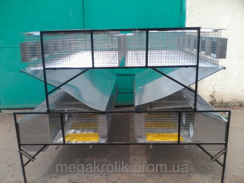 Изготовлена из оцинкованного металла (оцинкованная сетка и оцинкованный металлический лист) Оборудованая системами поения (трубы ПВХ квадратного типа 22х22 мм с вмонтированными ниппельными поилками 10022-Т), кормление (бункерные кормушки с двумя отделениями, изготовленные из оцинкованного металлического листа). Простая и удобная в эксплуатации, легко моется и дезинфицируется.