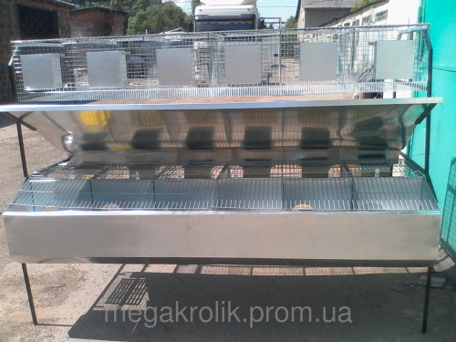 Изготовлена из оцинкованного металла (оцинкованная сетка и оцинкованный металлический лист) Оборудованая системами поения (трубы ПВХ квадратного типа 22х22 мм с вмонтированными ниппельными поилками 10022-Т), кормление (бункерные кормушки с двумя отделениями, изготовленные из оцинкованного металлического листа). Простая и удобная в эксплуатации, легко моется и дезинфицируется.