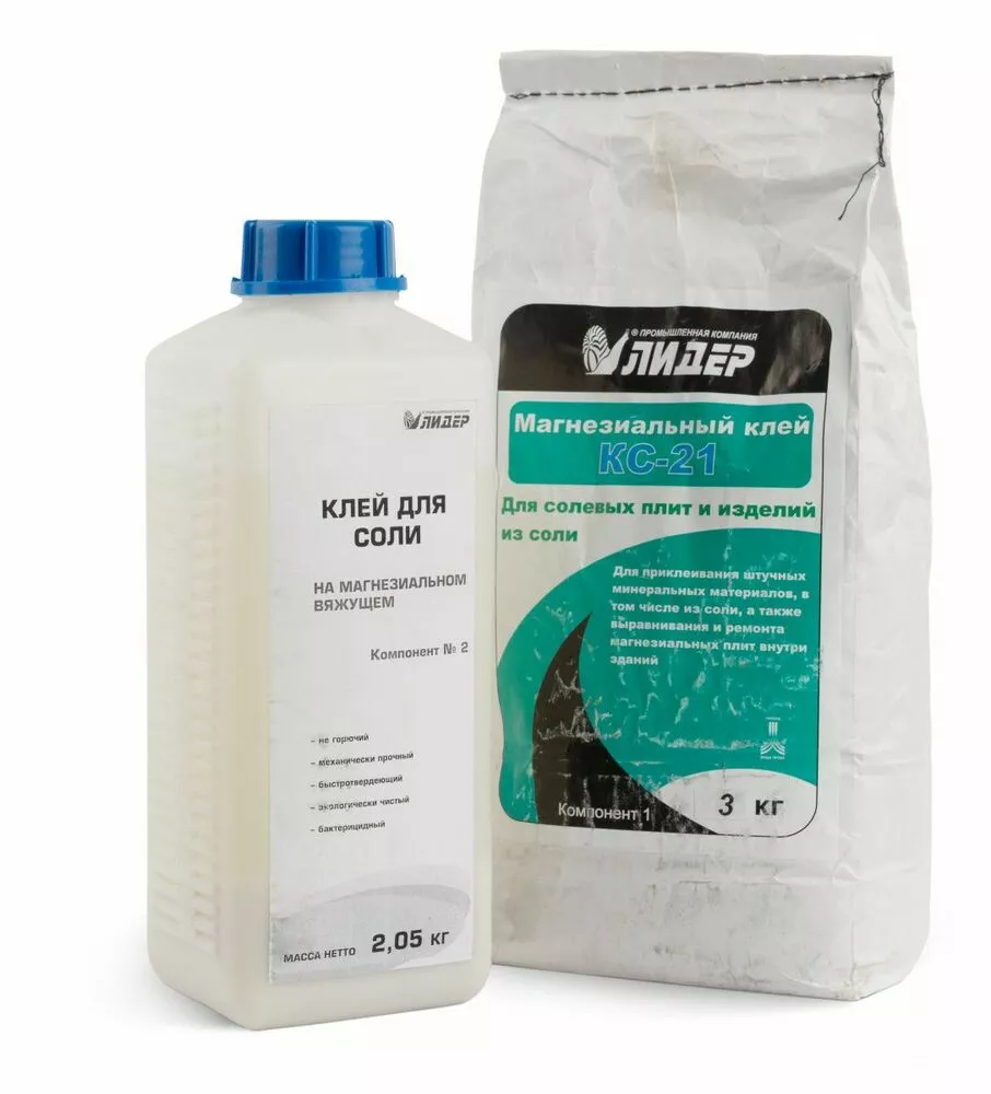 Клей для склеивания между собой плиток или кирпичей из гималайской соли представляет собой двухкомпонентную смесь. Первый компонент - пыль из той же самой пакистанской розовой соли, второй компонент представлен в виде жидкости (является вяжущим материалом). После смешивания этих двух компонентов получается однородная масса, которая и является клеем для изделий из гималайской соли.