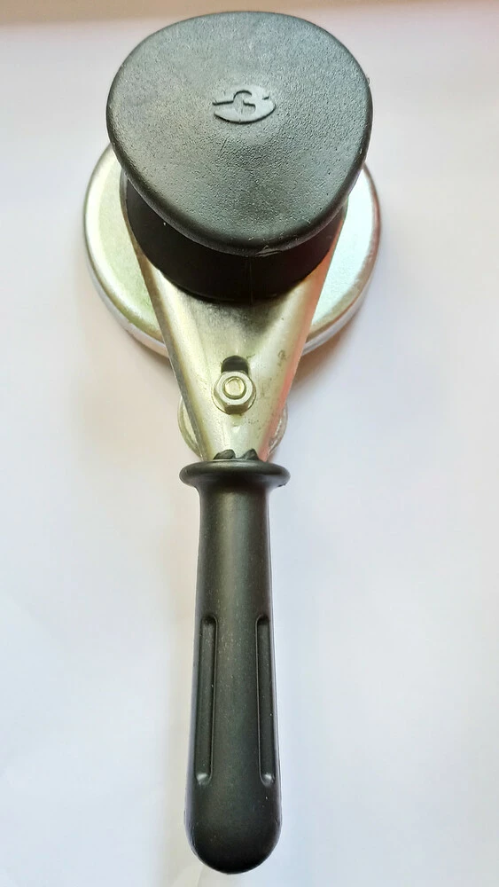 2. Установите машинку диском на крышку подготовленной для закупоривания банки, нажимая левой рукой ручку, правой рукой вращайте рукоятку вокруг по часовой стрелке до упора. После этого поверните рукоятку в обратную сторону и снимите диск с крышки банки.