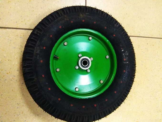 Колесо пневматичне — розмір 4.00*10 до будівельної тачки в повному зборі (диски сталеві на болтах, маточина алюмінієва, два підшипники (104), комплект гуми (покришка + камера), можлива доукомплектація віссю 20 мм)