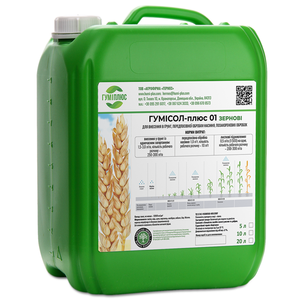 Для потреб зернових культур препарат стимульовано оптимальним набором біогенних мікроелементів, які за своєю природою близькі до сполук рослинної клітини, а тому не викликають у рослин відторгнення та є біологічно активними для росту та розвитку. Біодоступність біогенних мікроелементів – понад 90 %. Базові елементи живлення Гумісолу-плюс 01 Зернові швидко заповнюють дефіцит мікроелементів та забезпечують повноту живлення рослин.