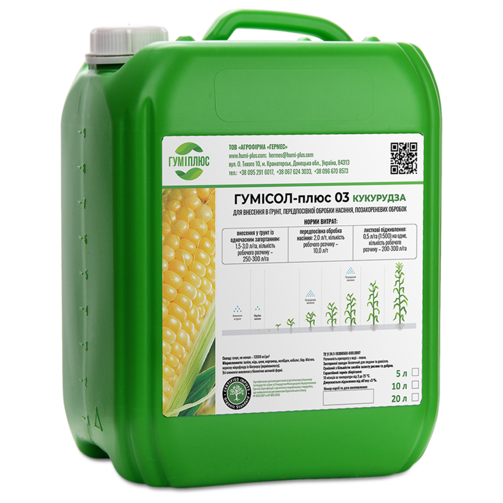 Кукурудзу відрізняють високі вимоги щодо живлення. Гумісол-плюс 03 Кукурудза містить основні елементи, які відповідають усім фізіологічним потребам кукурудзи та у найбільш критичні фази росту та розвитку рослин є особливо потрібними.