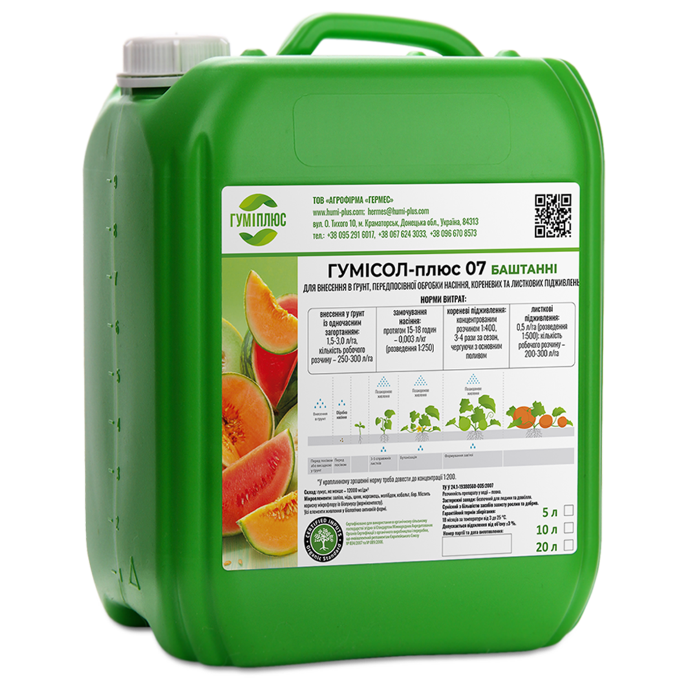 Спеціально для баштанних культур Гумісол-плюс 07 Баштанні стимульовано оптимальним набором біогенних мікроелементів, які за своєю природою близькі до сполук рослинної клітини, а тому не викликають у рослин відторгнення та є біологічно активними для їхнього росту та розвитку.