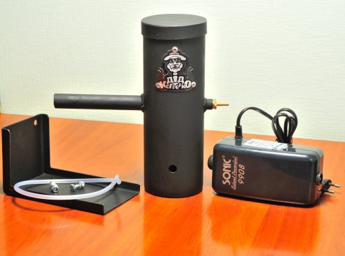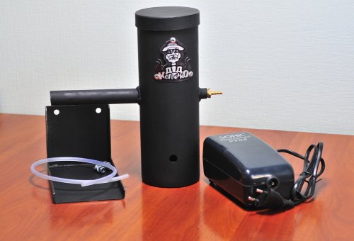 Размеры дымогенератора  – всего 250×90 мм.  Благодаря таким размерам и небольшому весу его удобно хранить, переносить и легко подключать к любой ёмкости для копчения. Несмотря на малые габариты дымогенератор тм «Дід Коптенко» позволяет загрузить полтора литра щепы и коптить непрерывно без присмотра от двух до четырёх часов (в зависимости от скорости подачи воздуха).