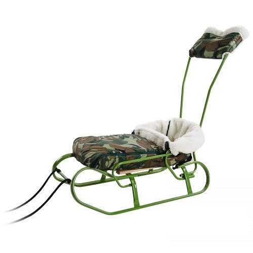 Санки "Мальчик Экспресс хаки" с конвертом из натуральной овчины имеют удобную съемную спинку. ручку-толкатель и теплую муфту для рук.
