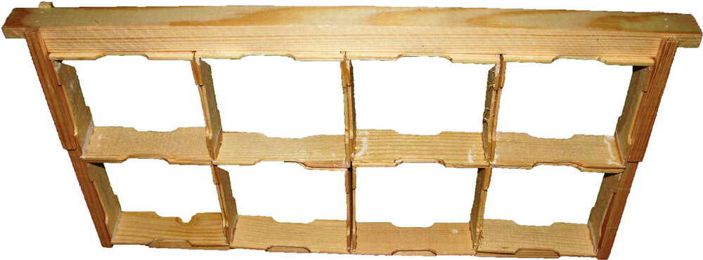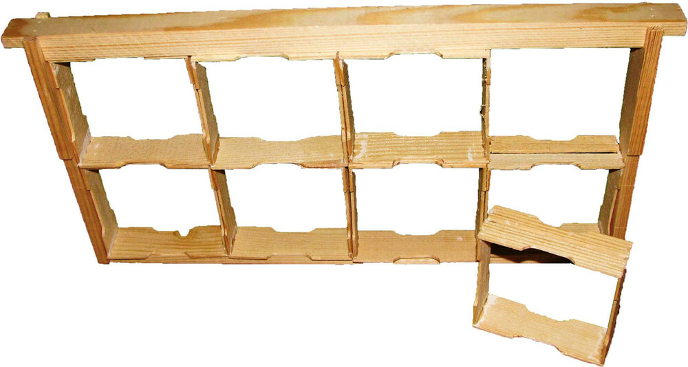 В комплект входит 8 рамок для сотового меда в сборе, каждая из которых вмещает примерно 250 грамм меда, а также сбитая рамка размером 435Х230 мм.
