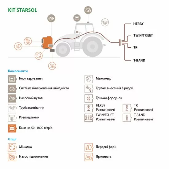Комплект STARSOL HERBY разработаны для опрыскивания локально или по всему участку инсектицидами, гербицидами и другими жидкими продуктами, полностью используя все преимущества комплектов Startec. Комплекты устанавливаются в основном на сеялках, машинах для пересадки растений, на прополювачах и косилках-измельчитель.