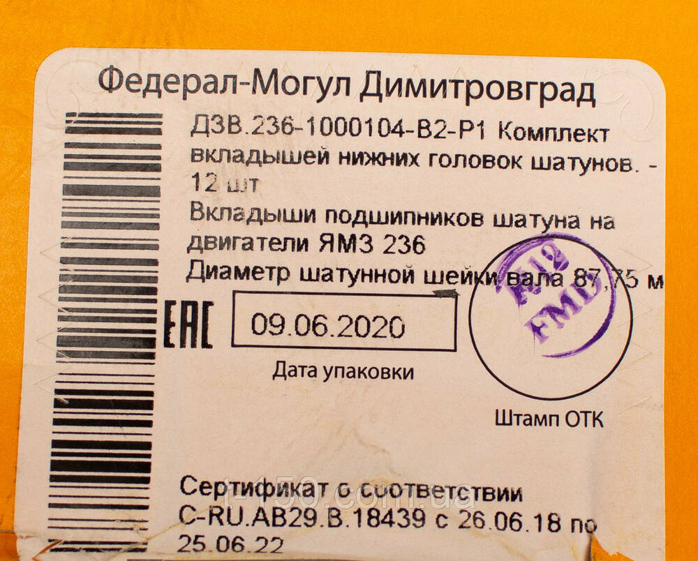 Вкладыши шатунные Т-150 МаЗ ЯМЗ-236, Р1, 236-1000104-В2-Р1