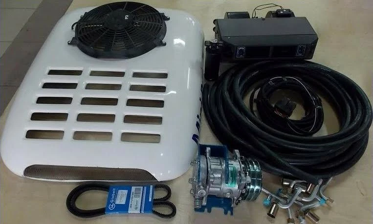 Комплект кондиционера: Испарительно-отопительный блок в сборе: медный теплообменник на два контура, встроенный вентилятор на три скорости, красивая панелька для выхода воздуха. Конденсатор медный или алюминиевый, по заказу, встроенный, в пластиковом корпусе увеличенной прочности со встроенным вентилятором. Разработан для установки на крыше трактора. Незаменим при решении проблемы перегрева двигателя трактора с уже установленными кондиционерами «Август 23БС-МТЗ-920», «Август 23БС-МТЗ-1025», «Август 23БС-МТЗ-1221», «Август 23БС-МТЗ-1523». Компрессор универсальный Санден 5Н14 фирмы Clove c усиленным корпусом для использования в тяжелых условиях эксплуатации. Фильтр ? осушитель, датчик давления, комплект шлангов.