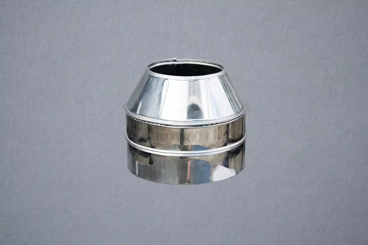 Конус двустенный для дымохода 150/230 - используется как верхнее окончание термоизолированного дымохода. Выполняет функцию защиты утеплителя от воздействия внешней среды. Соединяется с элементами системы дымохода без дополнительных креплений: "труба в трубу".