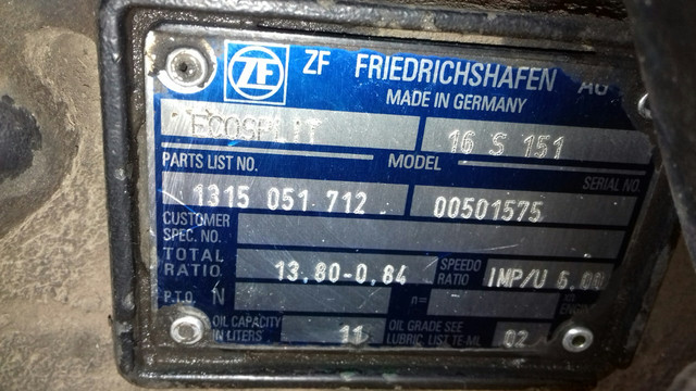 При заказе коробки отбора мощности и вала необходимо знать модель КПП. Модель КПП вы можете найти на боковой стороне КПП. Это небольшая металлическая табличка. Выглядит на КПП ZF следующим образом - КПП ZF 16 151.