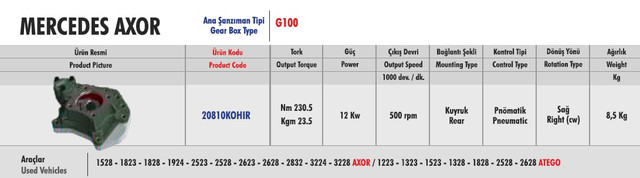 Коробки передач Мерседес Аксор G100 уже укомплектованы валами отбора мощности от производителя КПП, поэтому коробка отбора мощности состоит из муфты включения и плиты с креплением на 7 болтов. Также в комплекте есть шпильки, паронитовые прокладки и фиксатор резьбы.