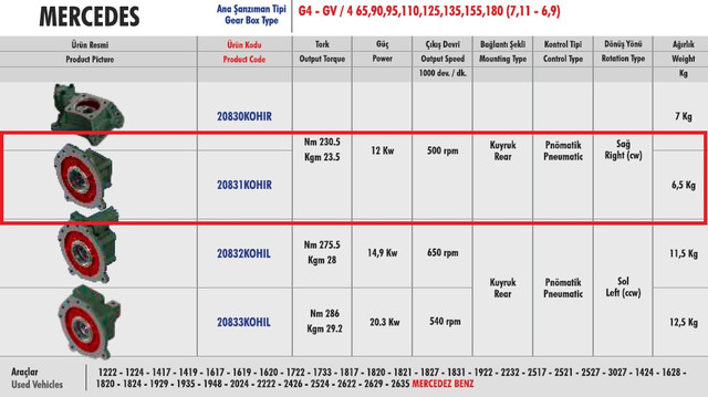 Коробки передач Мерседес G4-GV уже укомплектованы валами отбора мощности от производителя КПП, поэтому коробка отбора мощности состоит из муфты включения и плиты с креплением на 7 болтов. Также в комплекте есть шпильки, паронитовые прокладки и фиксатор резьбы.