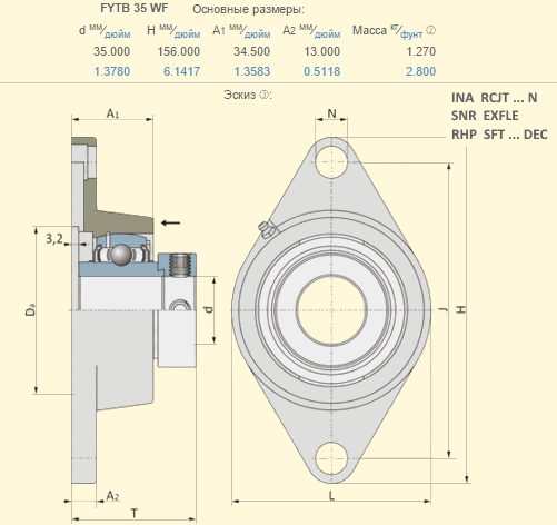 Крпусной подшипник​ Lemken 3199352 аналог FYTB35WF (подшипник YEL207-2F, GE35KRRB, EX207G2)