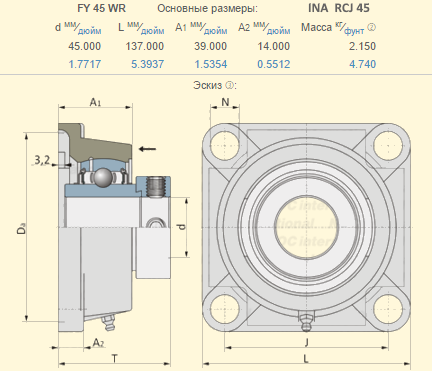 Корпус с подшипником Lemken 3199504 аналог RCJ 45, FY45WR (подшипник GE45KRRB, YEL209-2F)