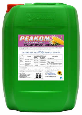 РЕАКОМ-ПЛЮС-ЦИНКОФОС - Хелатная композиция, содержащая в одном концентрированном растворе макроэлемент фосфор в виде фосфиты (РО3) и фосфонатов, а также микроэлементы - цинк, железо, медь, которая служат для внекорневой подкормки растений в периоды активного развития корневой системы растения.