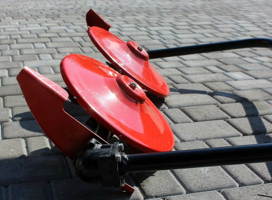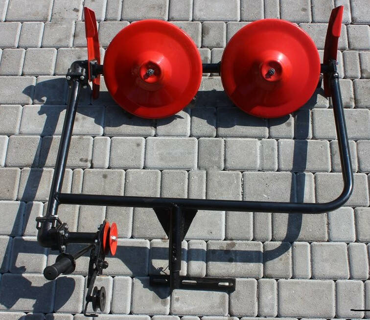 Два вращающихся на встречу диска обеспечивают ровный валок скошенной травы, без разброса.