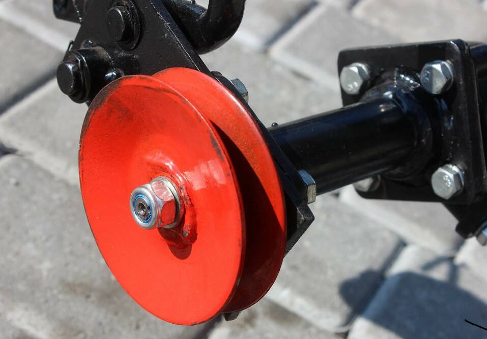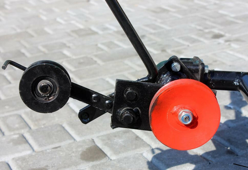 Привод осуществляется от шкива двигателя мотоблока на ведомый шкив косы для мотоблока.