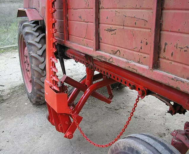 • закрепить тяговую цепь (в натяг), на последнее отверстие правого швеллера рамы трактора, используя болт трактора;