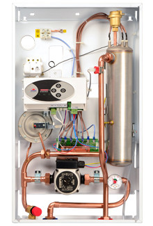 В комплектацию котла входит комнатный регулятор температуры, циркуляционный насос, группа безопасности и манометр.
