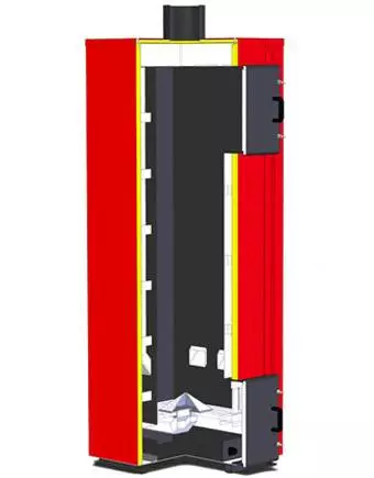 Котел AMICA TIME-40 – это котел с ручной загрузкой, уникальная конструкция которых запатентована и не имеет аналогов. Это котел нижнего горения. В её основе – дымоотводящие каналы и пирамидальная горелка с принудительной подачей воздуха, которые находятся внизу конструкции. Благодаря такому решению поддерживается постепенное сгорание топлива, так как процесс горения развивается в нижней зоне котла. Дымовые каналы проходят через воду, таким образом, дымовые газы максимально отдают своё тепло и на выходе имеют низкую температуру. Это обеспечивает эффективное сжигание топлива и оптимальную работу котла.