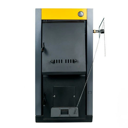 Среди преимуществ котла можно выделить его большую загрузочную камеру. Длительность горения на одной загрузке дров может достигать 10 часов. Также он может работать в системах отопления с естественной циркуляцией. Сам по себе котел энергонезависимый и для его эффективной работы нужно установить механический регулятор тяги. Большая загрузочная дверца помогает удобной загрузке топлива и также служит ревизионным окном для чистки теплообменника. Дымоход имеет круглое сечение.