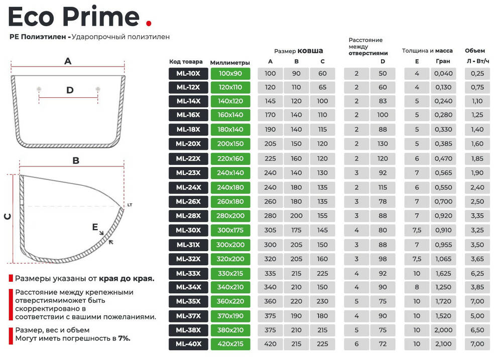 Ковш для норий ECO PRIME изготовлен из ударопрочного полиэтилена, обладает высокой твердостью, несгибаемостью, средней степенью сопротивления к трению.