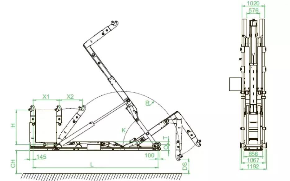H = Высота крюка, CH = Высота шасси, DS = Нижняя точка опрокидывания (зависит от высоты крюка и шасси)