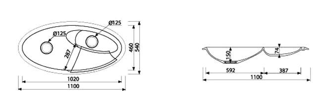Размер чаш: 592х460х150 мм, 387х190х74мм