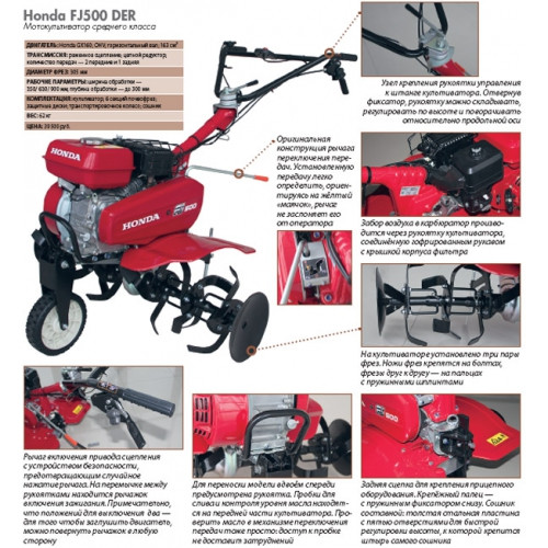 Представляем Вашему вниманию новейшую разработку компании HONDA, устройство для обработки сельскохозяйственных почв – культиватор HONDA FJ 500 DER. Устройство идеально подходит как для бытового, так и полупрофессионального использования, характеризуется высокой продуктивностью, удобством использования, а так же неприхотливостью. Главной особенностью данной модели является её адаптация специально под российский и украинский рынок. Бензокультиватор оснащается мощным мотором HONDA GX 160 (5 л.с.) позволяющим легко справится с любой задачей. Сбалансированность работы двигателя обеспечивают низкий уровень шума и вибраций, а также система декомпрессии, которая способствует легкому запуску двигателя бензомотокультиатора при любых погодных условиях. Так же данный культиватор характеризуется отличными возможностями при культивации, так как максимальная глубина обработки составляет до 30 сантиметров, а ширина – до 90 сантиметров. Аппарат оснащен удобными рукоятками со всеми органами управления, которые можно с легкостью настроить под индивидуальные пожелания оператора. Благодаря эргономичному дизайну, легкому весу и компактности данное устройство становится одним из лучших в данном ценовом сегменте.